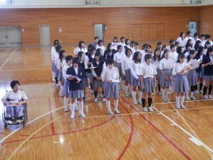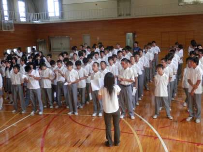 2年生は、全員が体育館に集まって入退場の練習と学年合唱の練習をしていました。