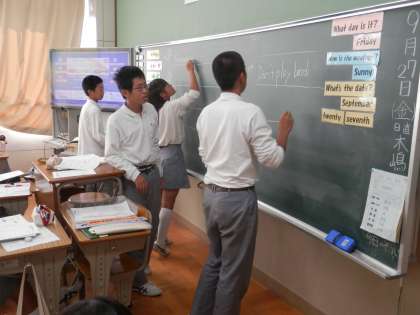 練習問題が出来た人から黒板に解答を書きに行きます。