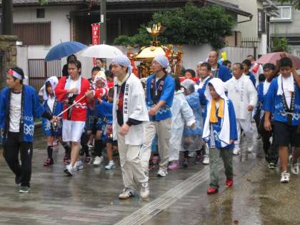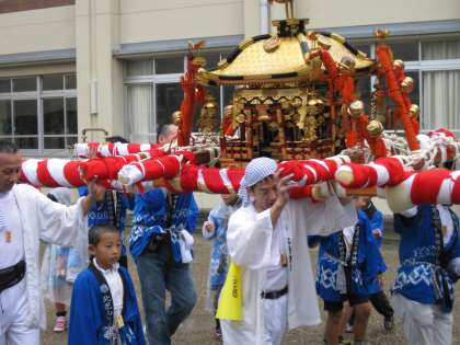 ところが、今年は岩屋神社の方では神輿の巡行を中止されました。そこで、学校の前で六所神社の2つの神輿が通るのを待ちました。
