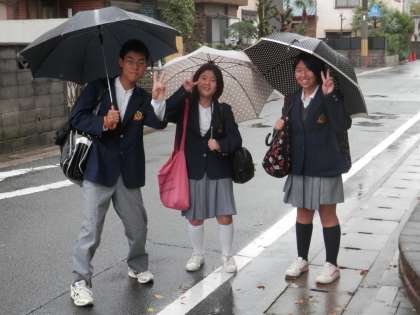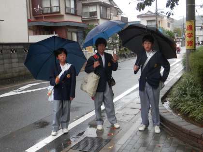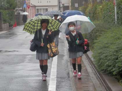 激しく雨の降る中を生徒達が登校してきます。8:00〜8:20の間は幾分か降り方がましでした。この間に登校した人はラッキーだったと思います。