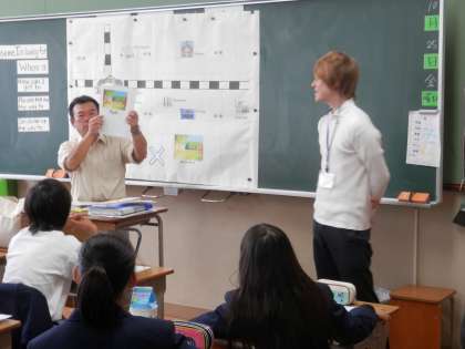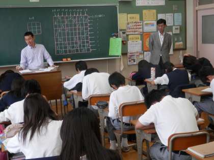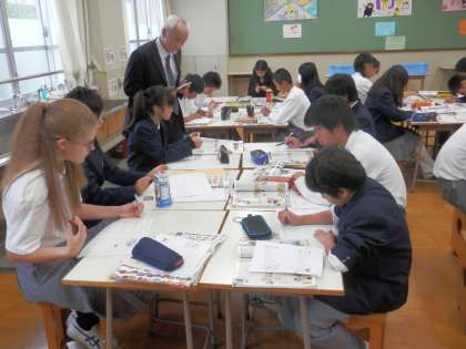 美術の時間には、指導主事の先生が参観に来ておられました。英語はALTのベンジャミン先生と齋藤先生との掛け合いが楽しかったです。