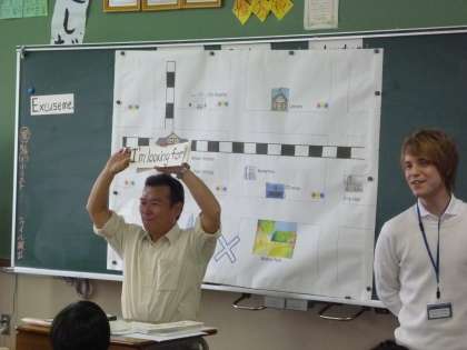 英単語のしりとりでウォーミングアップしたあと,地図を使って目的地まで行き方を教える英会話の授業です