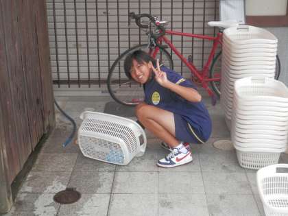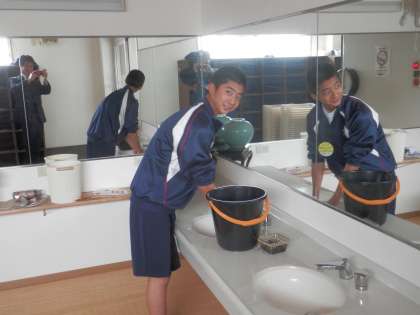 お風呂屋さんでは、お客さんが来るまでにふろ場や脱衣場、ふろおけをピカピカにしなくてはいけません。結構きつい仕事です。汗をかきながら頑張っていました。