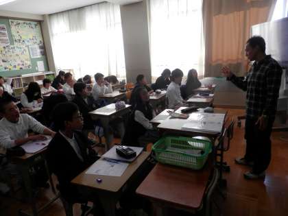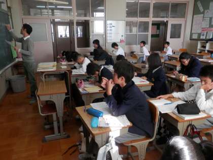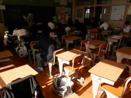 数学の授業を後ろから撮影しました。たくさん人のいない机が移っています。そうです。分割学習をしているのです。クラスの半分は別の教室で同じ内容の授業を受けています。もちろん、教える人数が少ない方が、教師は一人の生徒により深く関わることができます。