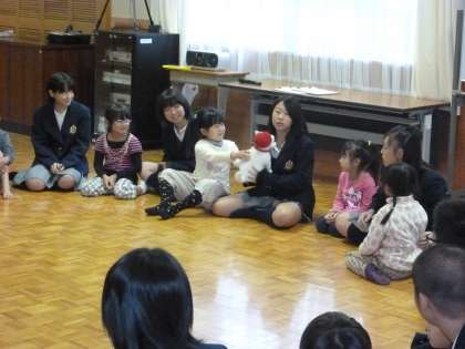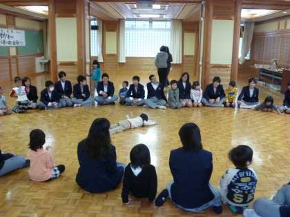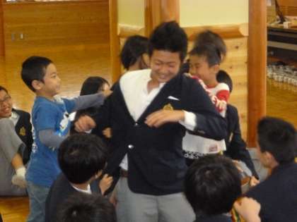3限に3年1組家庭科で鏡山保育所との交流授業が実施されました。まずは,輪になってゲームをして和やかなムードをつくりました。そのうち打ち解けてきたのか,幼児からもみくちゃにされる男子生徒もでてきました。