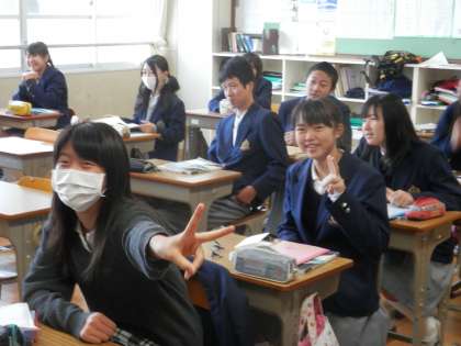 3年の理科で、代表生徒が黒板に円を描いているすきにカメラに向けてポーズを作りました。