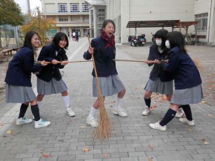 もうすっかり冬の朝です。校門の桜の葉がどんどん落ちて、毎日回収が大変です。今日も吹奏楽部の子たちが拾い集めてくれていました。