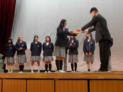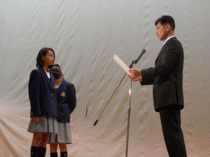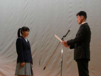 美術の作品がたくさん賞を獲得しました。代表者に賞状を受けとってもらいました。