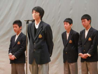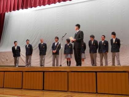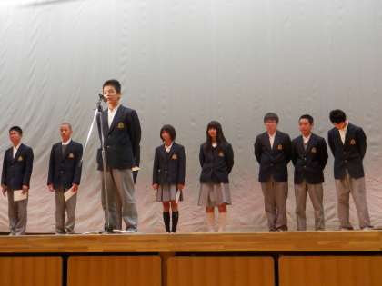 新生徒会本部役員の認証を行った後、新役員が一人ずつスピーチをしました。