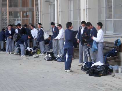 野球部の生徒達は、朝練習を終えて制服に着替えています。