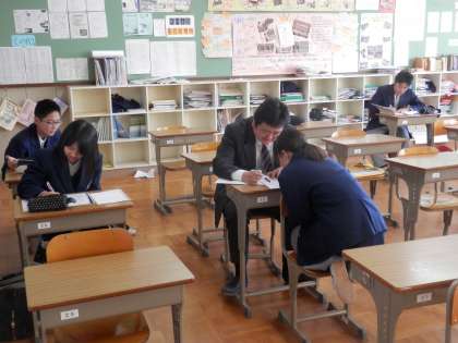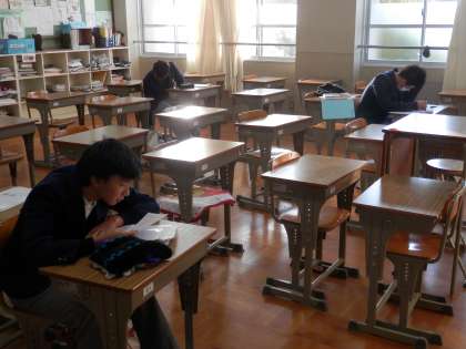 上の階に行く途中、3年生の教室を除くと、勉強をしている人たちを見つけました。