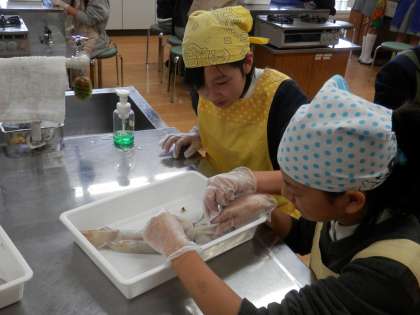 2人に1匹のイカがあてがわれ、熱心にさばいていました。