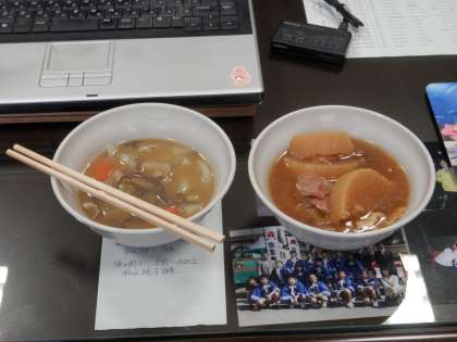 6組の生徒達が調理実習で作った豚汁をもって来てくれました。