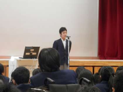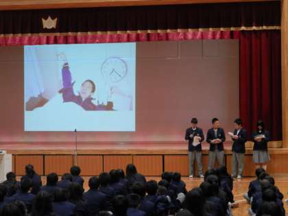 生徒会長の年始の挨拶に続いて、生活保健委員会より生活点検の報告と、規律正しい生活の確立に向けて提案がありました。