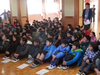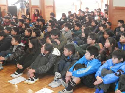 生徒会本部の人たちは、パワーポイントを頑張って作りました。6年生たちは、食い入るように画面を見ていました。