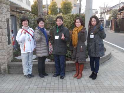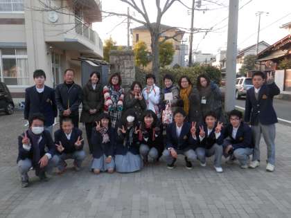 PTA本部の人と生徒会本部の人が揃う賑やかな校門の風景です。