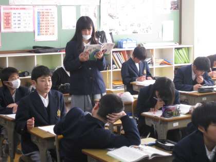 先生の問に対して挙手をして答えている場面です。