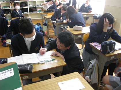3年では、ほとんどの教科で既に教科書を終え、高校入試の過去問題に取り組んでいます。社会と数学の時間もそうでした。