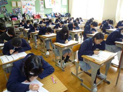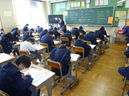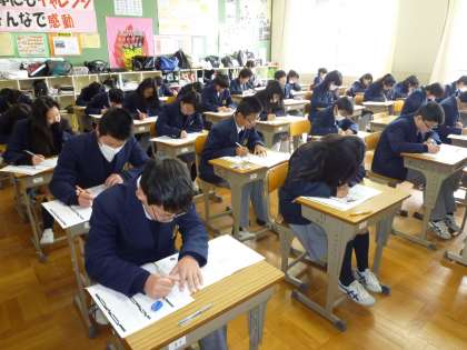今日は,1・2年の第5回定期考査(以前は学年末考査とよんでいました)の1日目です。学年最後の定期考査に,各自真剣に取り組んでいます。