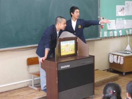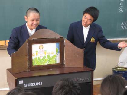 紙芝居を読み聞かせながらも、時には小学生に意見を聴くなど、相当なテクニックを使っていました。そのお陰で、児童達はとても喜んでいました。