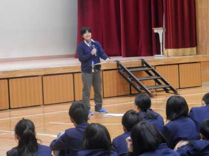 また、生徒会長が生徒会の総括と春休みの過ごし方についての注意をしたのち、生徒指導部から、今回は大賀先生が話をされました。