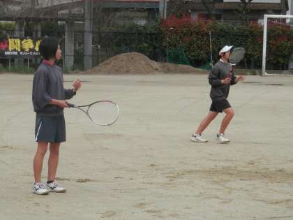 テニスコートがぬかるんでいるので、野球部が練習を始めるまでの間グランドの中央付近で乱打をしていました。