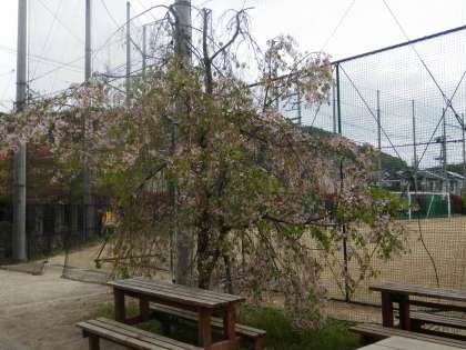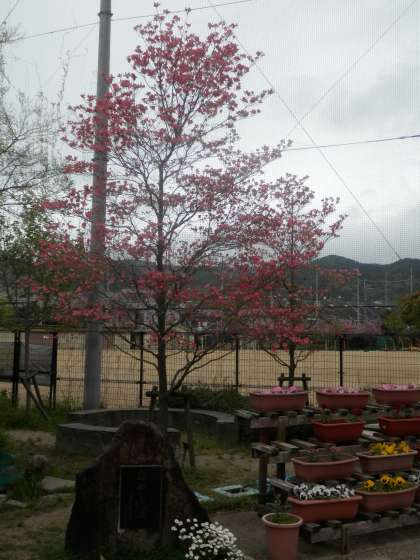 校門付近では、ハナミズキが美しく咲きました。その後ろの枝垂桜は、残念ながら見ごろを過ぎましたが、グランド北側の八重桜が満開です。