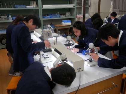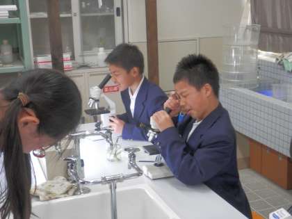 理科の授業では、顕微鏡を使ってものを見る練習をしていました。