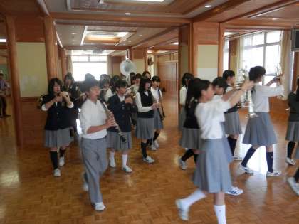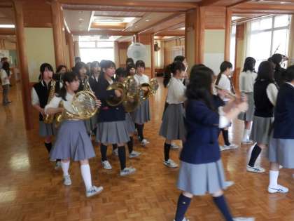 多目的室では吹奏楽部がマーチングの練習をしています。