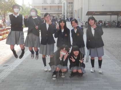 校門付近の清掃をしてくれている吹奏楽部の皆さんの写真を撮影したところ、済ましている人たちの中にジャンプしている人がいます。上手く撮影できたものです。