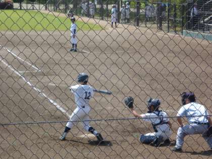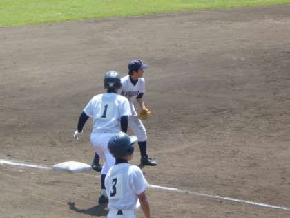 試合は中盤になり動きはじめます。まずは桂中学校が花山中学校のミスに乗じてチャンスを作りますが,花山はピッチャーを中心に決定打を許さず無得点に抑えます。花山はなかなかチャンスを作れませんが,5回裏,相手のエラーから1アウト1・3塁。ここできっちりとセンターへの犠牲フライを打ち1点先取。