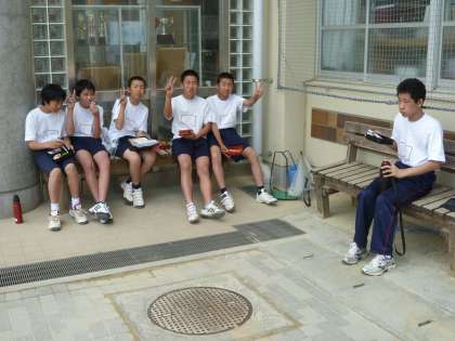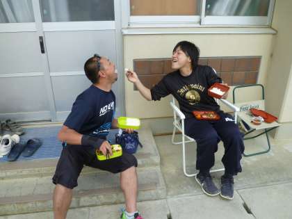ランチタイムの様子を撮っていたらお調子者の先生2人がふざけていました。まわりの生徒は引いています。