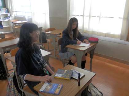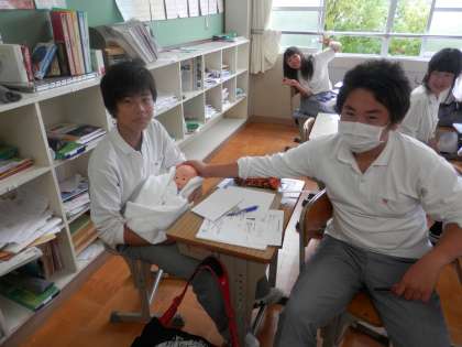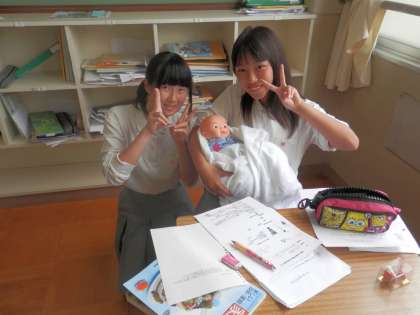 家庭科では、生まれたての赤ちゃんの人形を抱いて、育児体験です。