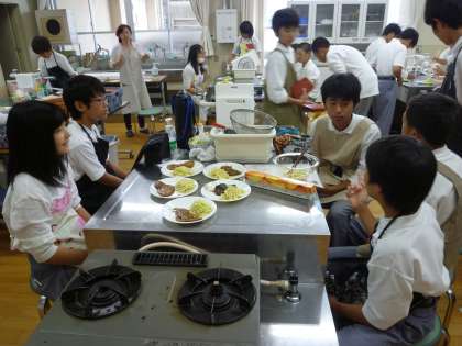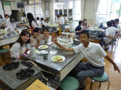 4限終了間際に,調理室から食欲をそそるいい匂いがしてきたので,覗いてみたら,調理実習が終わり,今から食べようというタイミングでした。