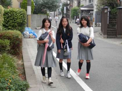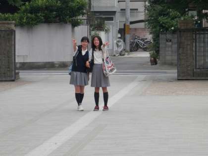 いつもの時刻に玄関を出たところ、誰もいない校門からの通路に3年生が2人やってきました。