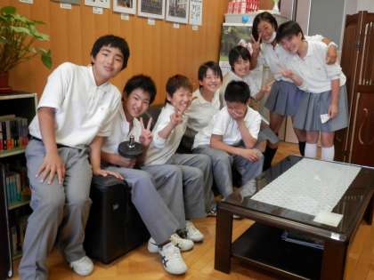 授業の初め、3年生が密かにカメラに向かっていたところと、今日も賑やかな昼休みの校長室です。