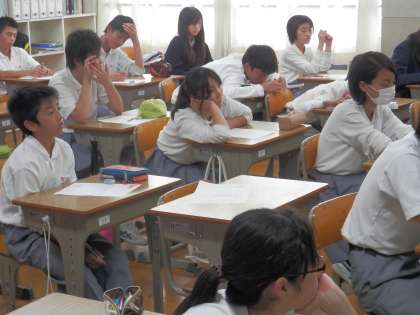 DVDを見る様子、意見と感想を書く様子、それらを交流する様子、先生の話を聞く様子、どれもとても真剣で、中学生らしい初々しいものでした。
