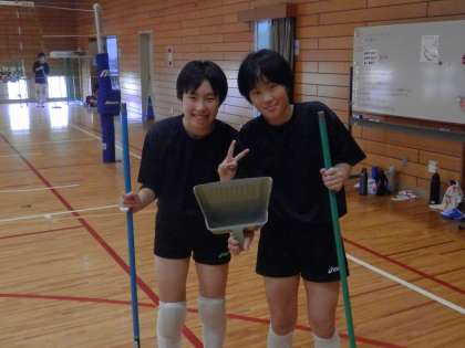 女子バレー部は、まだ準備の段階です。アリーナの床を磨いているところでした。