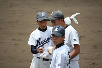 曇り空とはいえ気温は高く、マウンドに向かう前にはチームメイトが体を冷やします。