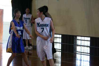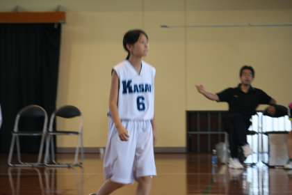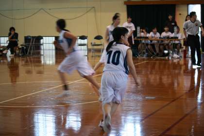 ゴール下でリバウンドをとった選手がロングパスを堀田さんに送りました。堀田さんの横には北川さんがついて走っています。