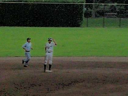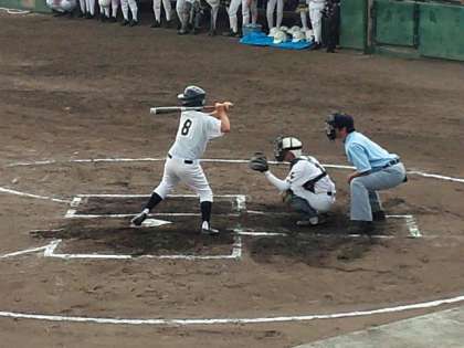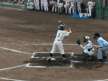 花山中学校の攻撃。粟津君2塁打。村上君死球。小幡君がセンターへの大飛球でしたが,相手外野手のファインプレーに阻まれ先制点を奪えず。