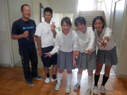 体育館の前で、2年生の女子たちと一緒に写真に入りました。