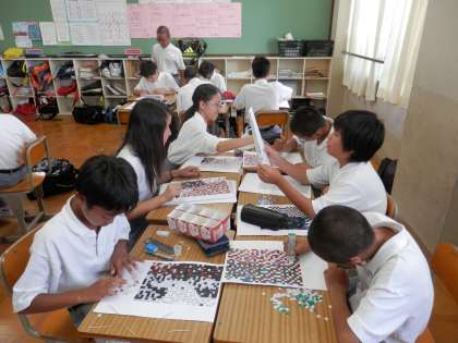 1年生がモザイク壁画に一生懸命取り組んでいます。