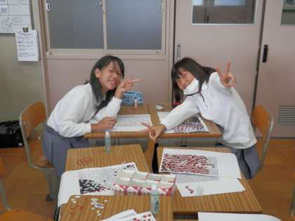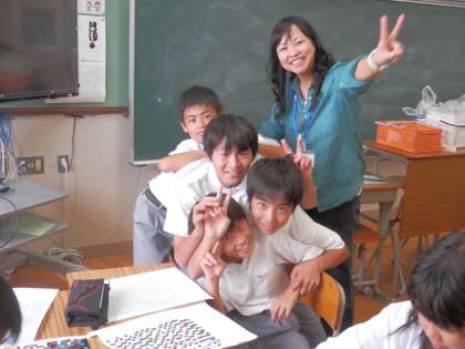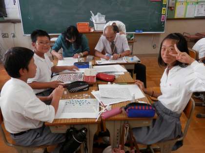 あれっ、あの頭は…、学年主任の山口先生が1−2の作業を手伝っていましたよ。