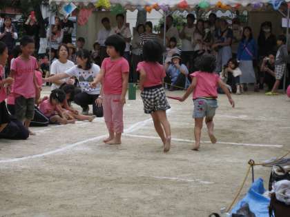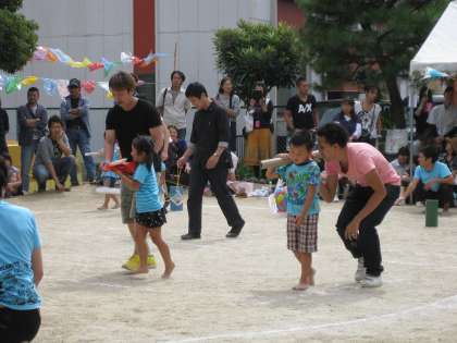 保育所の園庭一杯に子どもと保護者の方がいました。