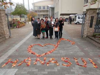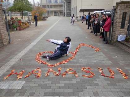 落ち葉の芸術のお蔭で、校門付近は朝から大盛り上がりでした。