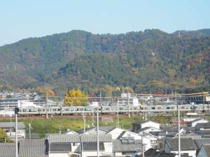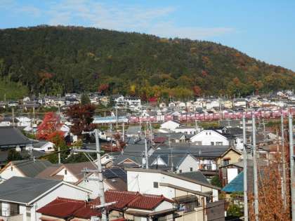 朝の光に照らされて紅葉に色づく西と北の山肌が美しく、思わず4階まで上がって写真を撮りました。