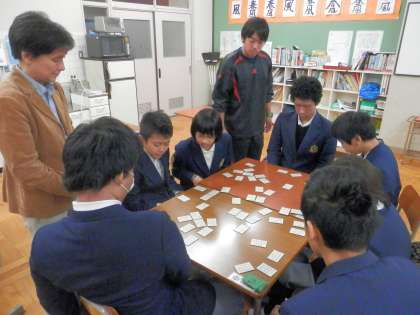 先生が上の句を読んでいる間に札をとれる人もいます。大したもんです。