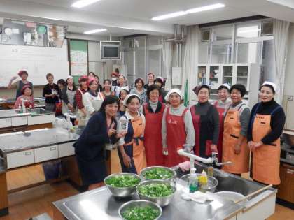 2学区の女性会の皆様と3小中学校のPTAの皆さまが、コリーンキャンペーンへの参加者にふるまう豚汁を完成させておられました。