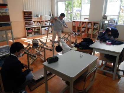 休憩時間、1年6組の人たちは、教室の掃除と机といすの高さの調節です。